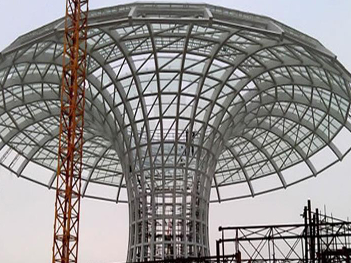 二、球形网架结构因其结构新颖,受力合理,自重轻、用钢量低等优点。如大型体育场馆球形江山螺栓球网架、公共场馆球形网架、电厂江山螺栓球网架、水泥工业球形网架、仓储物流球形网架、江山干煤棚工业球形网架、江山收费站江山加油站球形网架、展览中心、影剧院、商场、航站楼、候车厅、工厂江山车间、仓库、电视塔等球形螺栓球节点网架。国内球形网架结构主要分为:江山焊接球节点网架及螺栓球节点网架两种。螺栓球节点网架其构件工厂内加工量较大,现场安装便捷,适用于现场工期紧,江山施工条件、用电量受制约,网架形状复杂、江山杆件定位困难的异形结构。螺栓球节点球形网架系统基本由江山杆件、螺栓球、支撑支座等组成。按照节点形式可分为交叉江山桁架体系、四角锥体系、三角锥体系等。支撑方式多为固定支座支撑。对于大面积、大跨度及有特殊受力或伸缩要求的网架结构可采用橡胶支座、滑移支座、球铰支座等支撑形式,以满足结构自身的受力稳定、均衡,便于内力释放等设计要求。